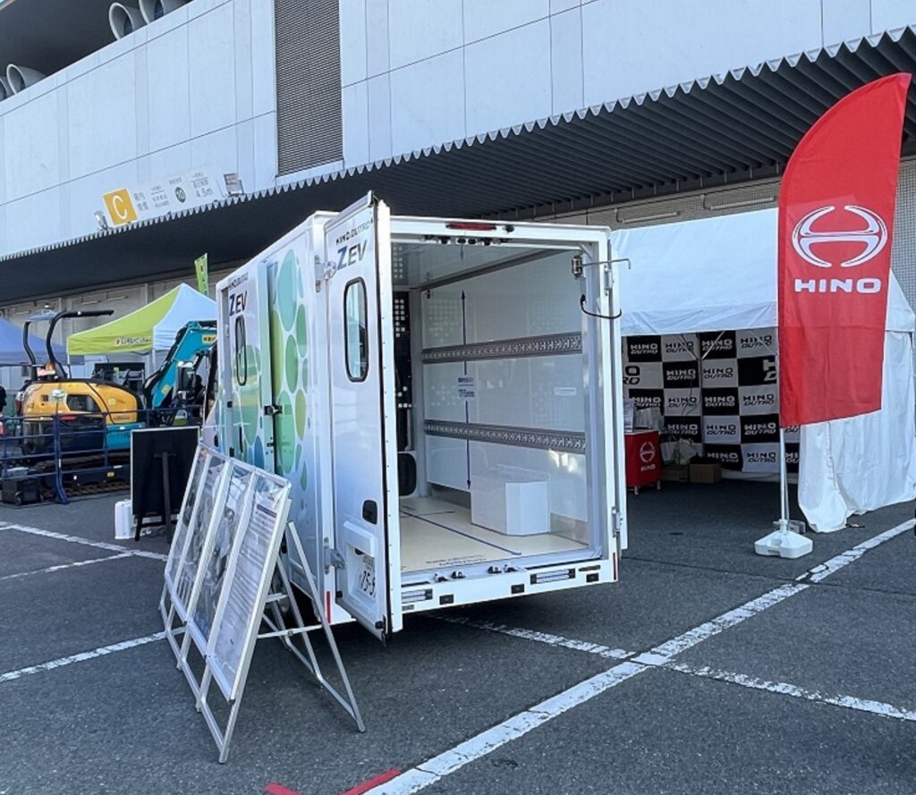 当社は『 人流・物流 生産性向上フェアin熊本 』ブースにて< クリーン走行を実現する小型BEVトラック >の紹介として 新型電気自動車≪HINO DUTRO ZEV≫ の実車展示を行いました。